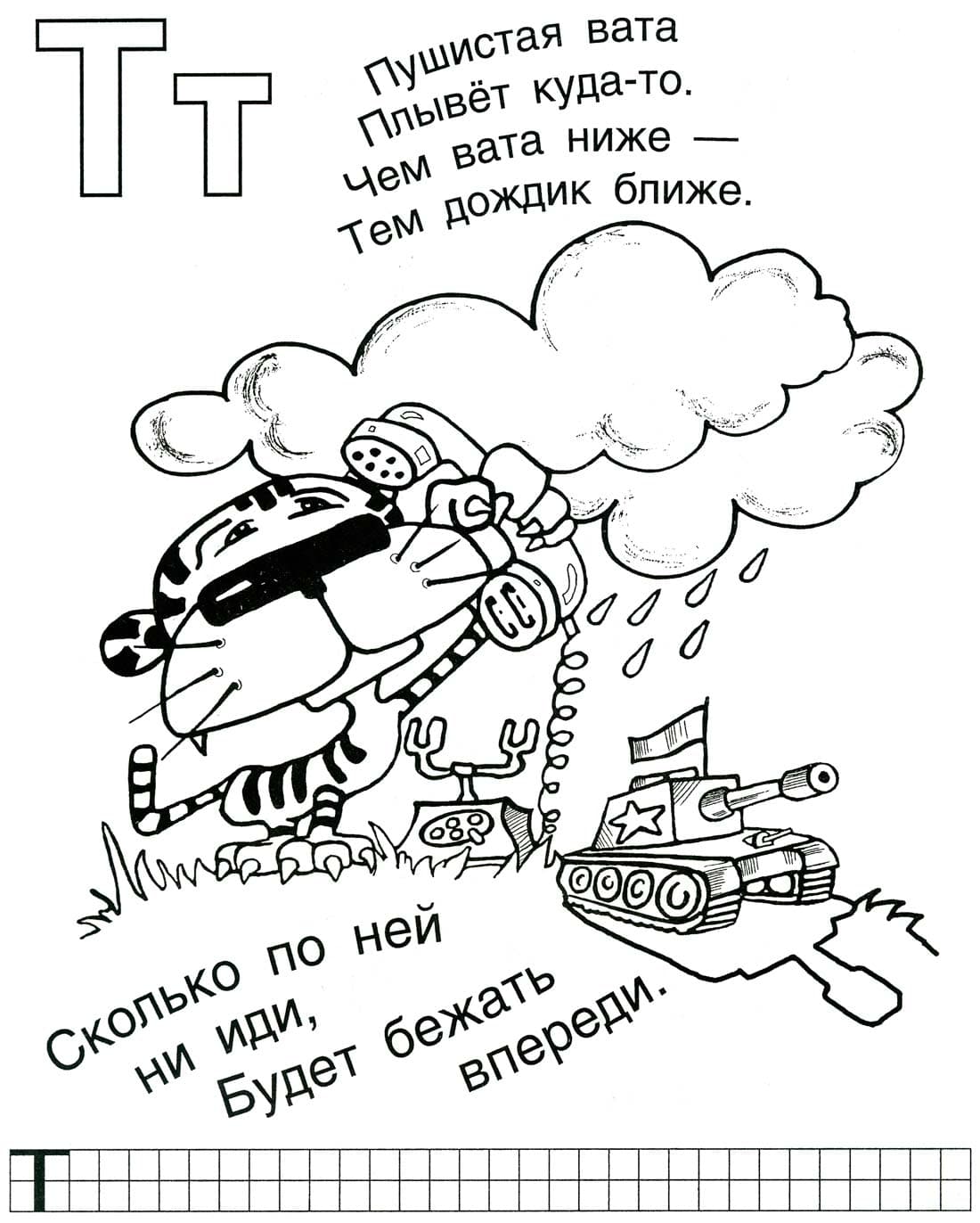 Буква Т - двадцатая по счету буква в русском алфавите. На эту букву начинаются следующие известные всем слова: тень, танк, трактор, телевизор, товар и многие другие. Раскрашивая букву Т, ребенок без труда сможет запомнить как она выглядит, а сам процесс раскрасшивания положительно влияет на развитие мозга ребенка. Одними из популярных изображений данного раздела являются: маленький теленок, тигр на танке и красивая черепаха, которая стоит под буквой. На нашем сайте Вы совершенно бесплатно можете скачать и распечатать раскраску буквы Т в хорошем качестве.