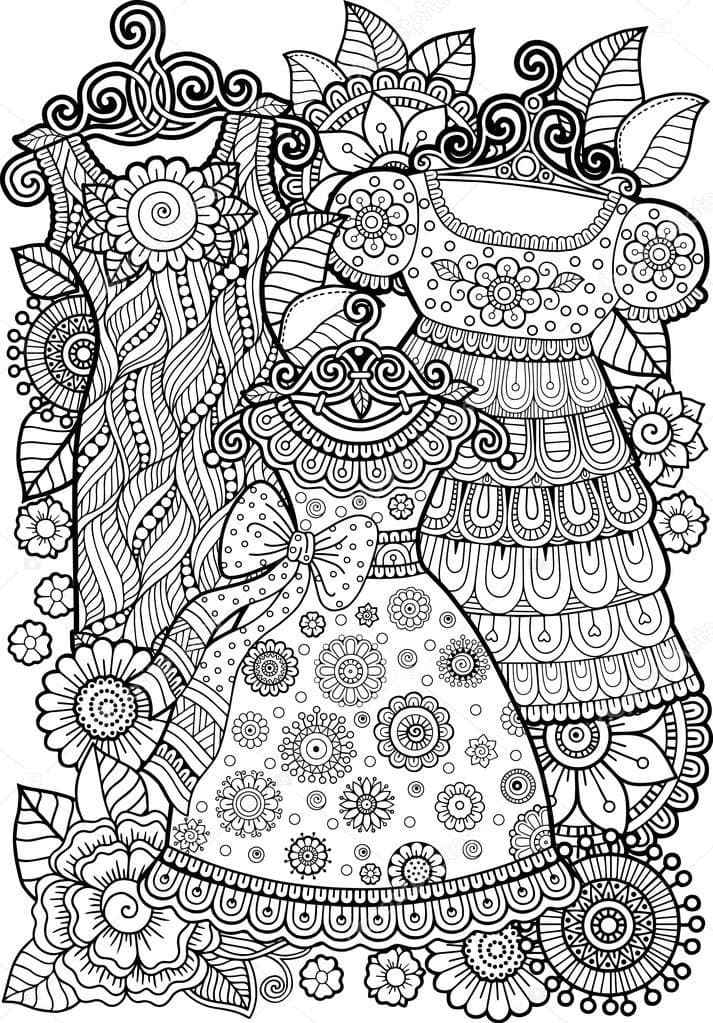 На нашем сайте Вы можете скачать и распечатать раскраску платье в хорошем качестве, совершенно бесплатно. Нежный женский образ подчеркивает такая одежда, как платье. Они бывают строгого силуэта или воздушного фасона, с рукавами и глухим воротом или с широким вырезом и разрезами на подоле. Праздничное платье всегда смотрится более выигрышно, чем костюм. В нем представительница прекрасной половины человечества предстает более нежной, романтичной, воздушной. Во время раскрашивания улучшается мозговая деятельность ребенка и развивается моторика рук.
