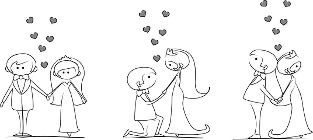 На нашем сайте Вы абсолютно бесплатно можете скачать и распечатать раскраску жених и невеста в хорошем качестве. Когда девушка и парень, полюбив друг друга, собираются пожениться, они вступают в статус жениха и невесты. В старину проводили специальную церемонию, на которой официально молодая пара объявлялась женихом и невестой. Жених дарил невесте кольцо, как бы закрепляя слово. Во время раскрашивания развивается моторика рук и улучшается мозговая деятельность ребенка.