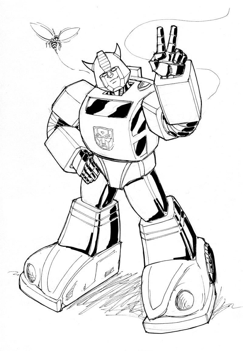 На нашем сайте Вы совершенно бесплатно можете скачать и распечатать раскраску Бамблби в хорошем качестве. Бамблби это один из самых знаменитых роботов трансформеров в мире. Его ключевой особенностью является отсутствие речевого модуля, разбитого в боях со злыми десептиконами. Он преобразуется в желтую с чёрными полосами Шевроле Камаро. По сюжету он был ошибочно куплен главным героем в качестве первого автомобиля после колледжа. Это стало поводом для их длительной дружбы. В момент раскрашивания развивается моторика рук и улучшается мозговая деятельность ребенка.