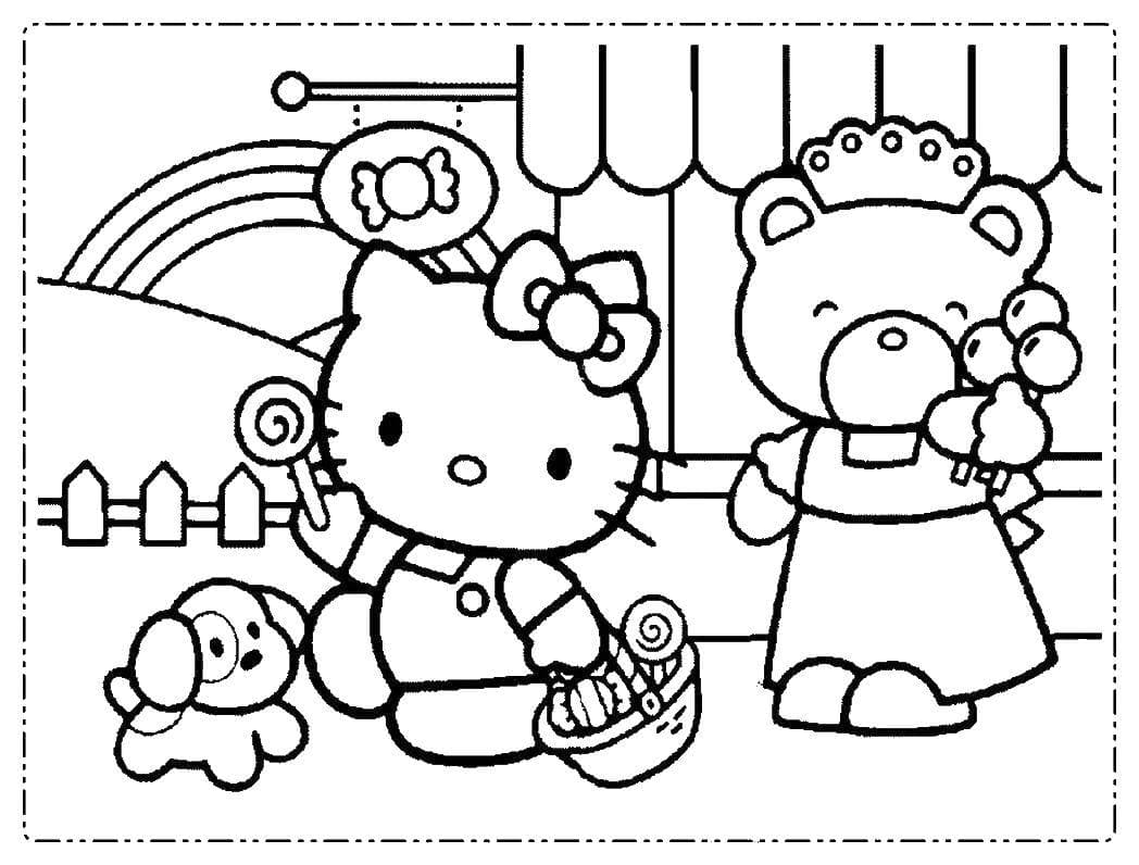 На нашем сайте Вы совершенно бесплатно можете скачать и распечатать раскраску Хелло Китти в хорошем качестве. Хелло Китти это популярная анимационная серия для маленьких девочек, созданная японскими художниками. Популярность пришла к ней из-за очень милой внешности котят и простоты их линий. Дети сами принялись успешно рисовать любимых персонажей, а также изготавливать кукол по мотивам. В момент раскрашивания у ребенка развивается моторика рук и улучается мозговая деятельность.