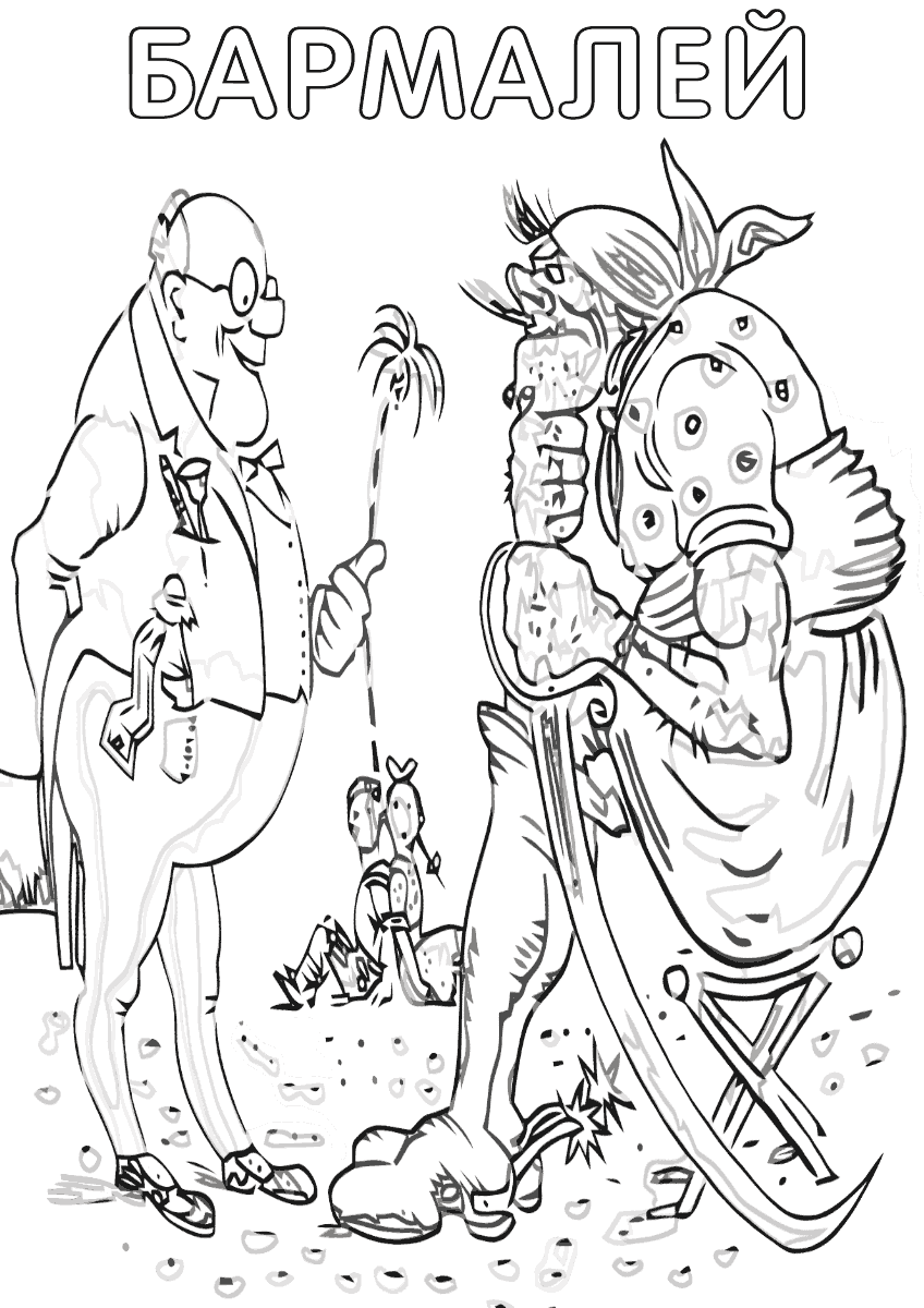 Чуковский Корней Иванович написал интересную сказку под названием "Бармалей", в которой рассказывается о злодее проживающем в Африке. Бармалей любит обижать животных и детей, он смог украсть даже доброго доктора Айболита, вместе с его друзьями. Храбрый и веселый попугай по имени Карудо помогает победить Бармалея и избежать заточения Бармалея. На нашем сайте Вы можете совершенно бесплатно скачать и распечатать раскраску Бармалей в хорошем качестве. Девочки и мальчики очень любят этого персонажа и смогут почувствовать себя настоящими художниками.