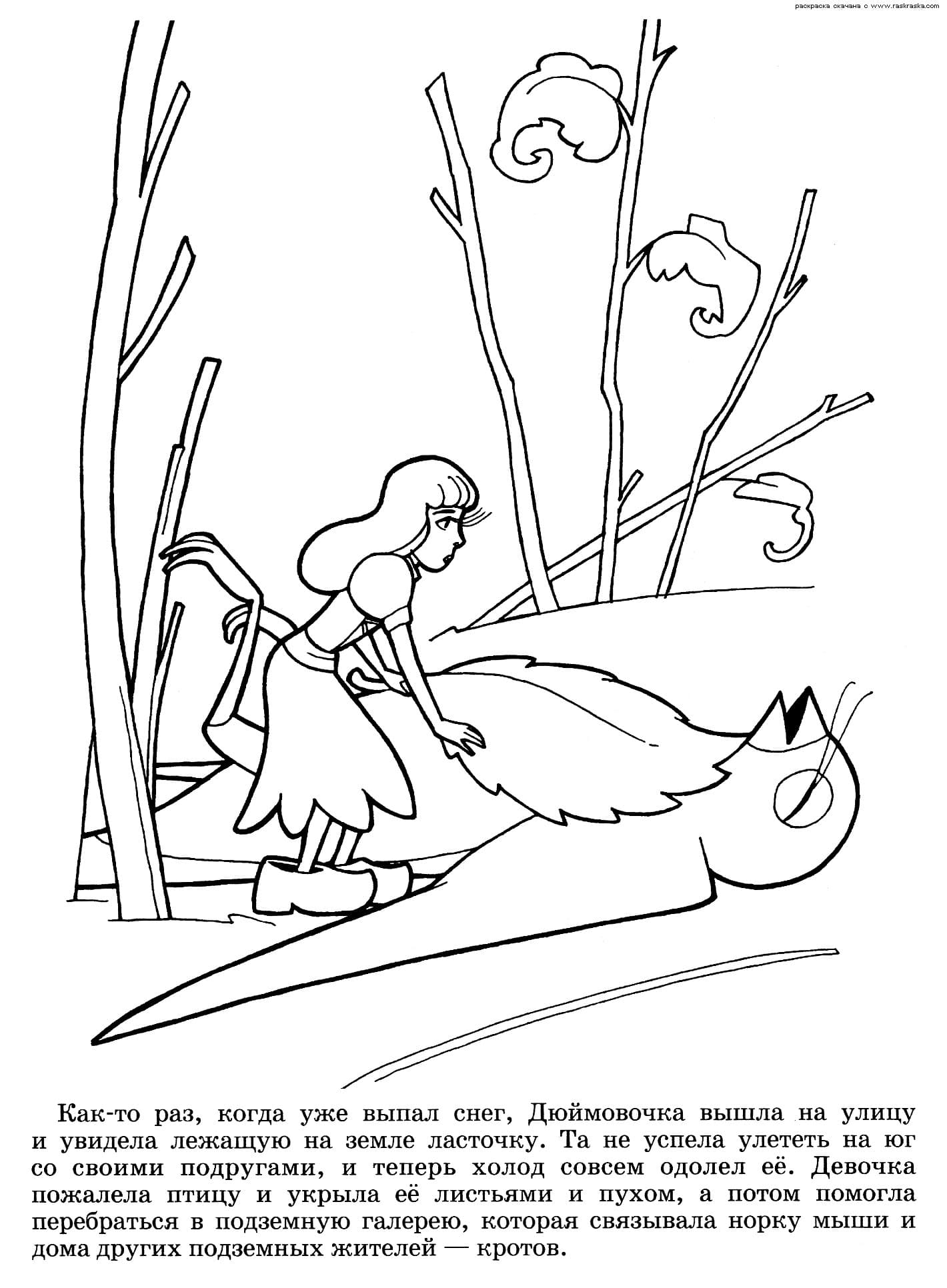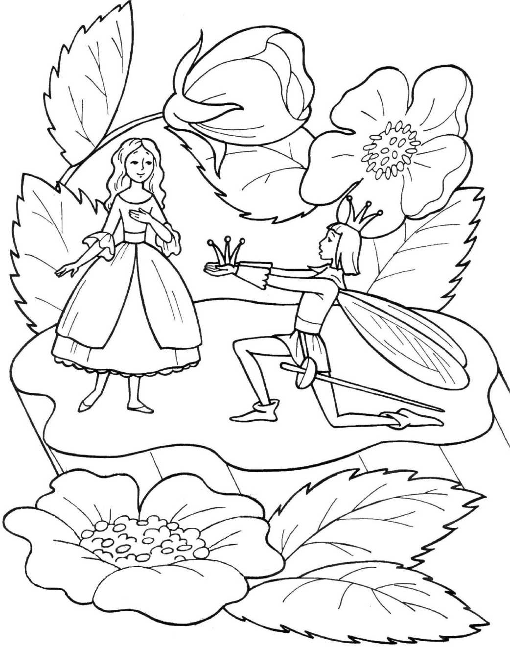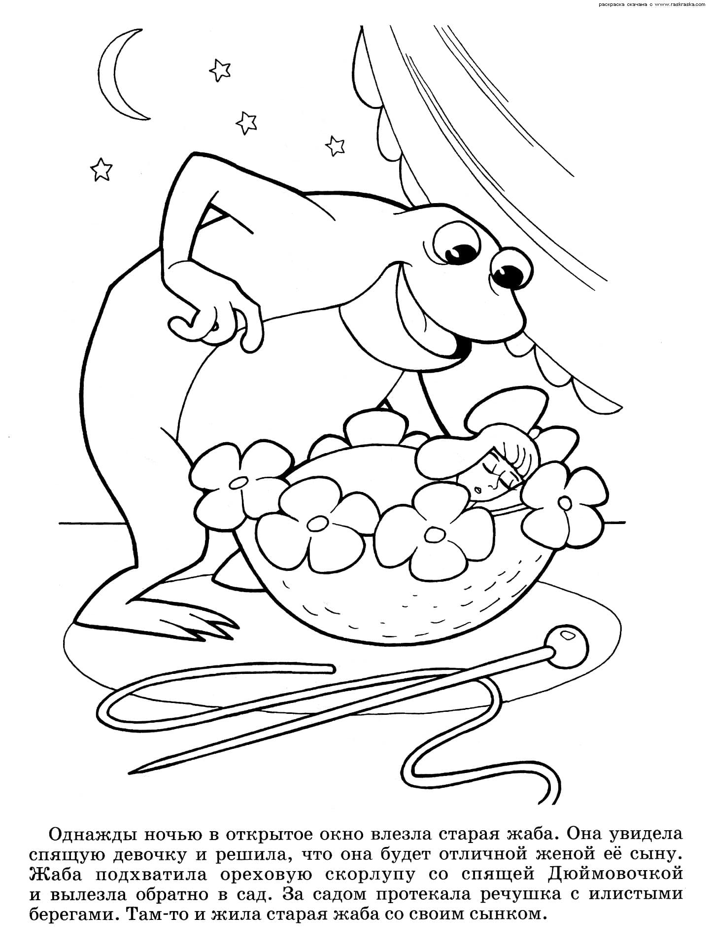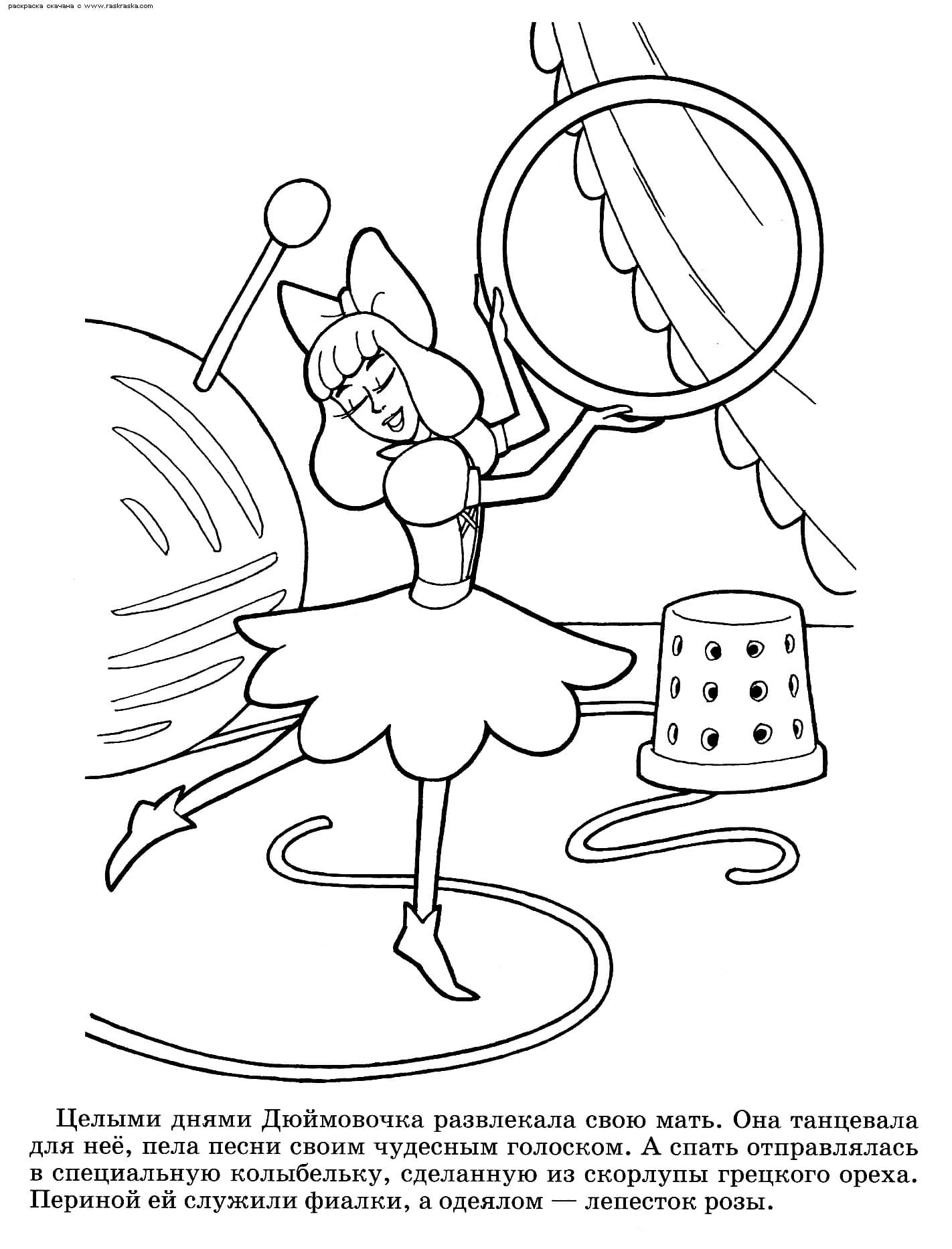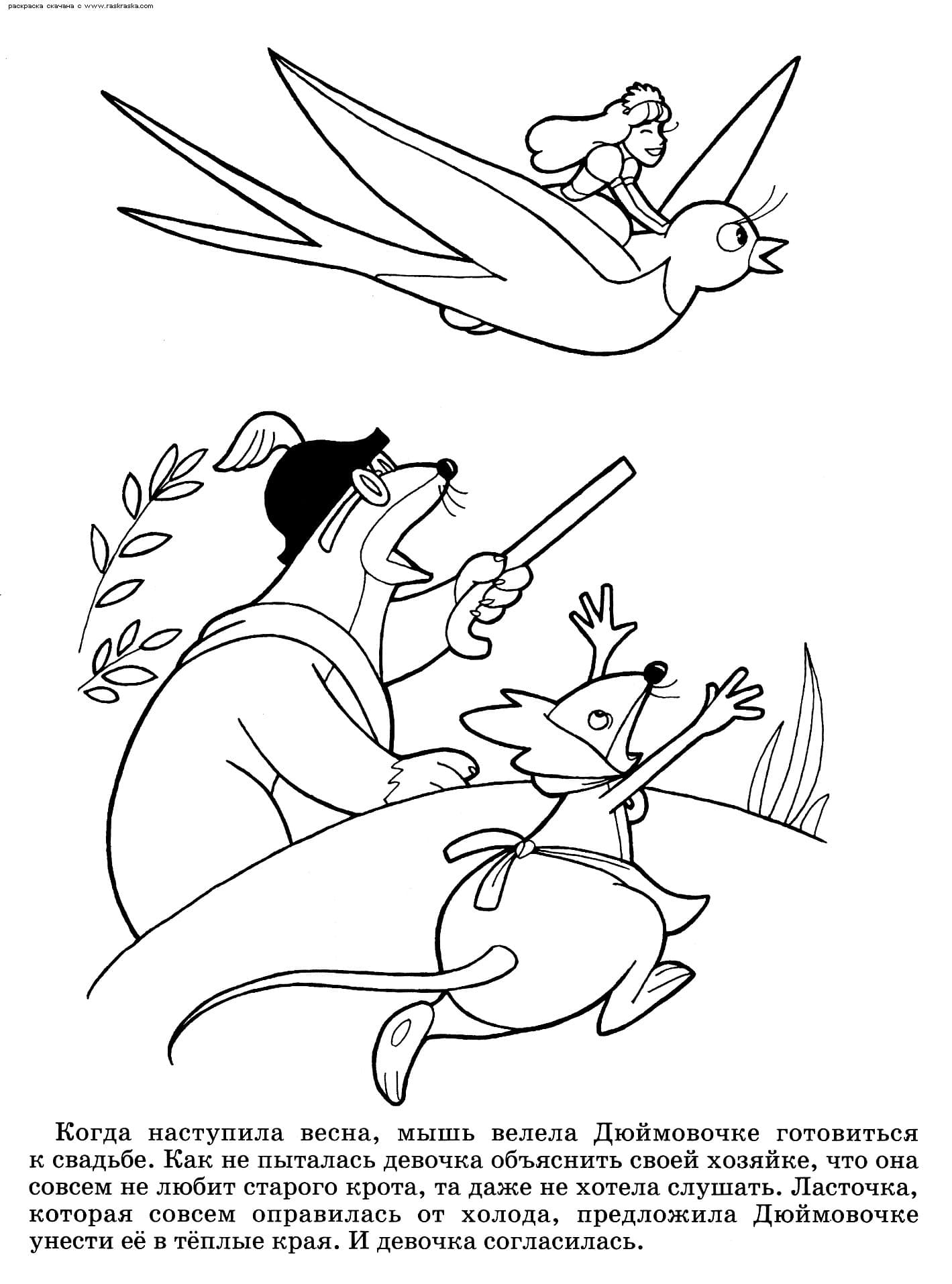 Знаменитая сказка, написанная Гансом Христианом Андерсеном, обретает свою новую жизнь вместе с современной музыкой, пением и танцами. Он переносит зрителя в волшебный мир, где живет рассказчик Оле-лук-Мэй. Он машет волшебной палочкой, и из чудесного цветка появляется крошечная девочка, не больше большого пальца. Сказка рассказывает о приключениях Дюймовочки в старом жилище полевой мыши; с женоподобными болотными жабами, оленьими жуками и кротом. Она успешно избегает их намерений, убегая с ласточкой в далекую страну, где влюбляется в цветочного сказочного принца. На этой странице Вы можете совершенно бесплатно скачать и распечатать раскраску Дюймовочка в хорошем качестве.