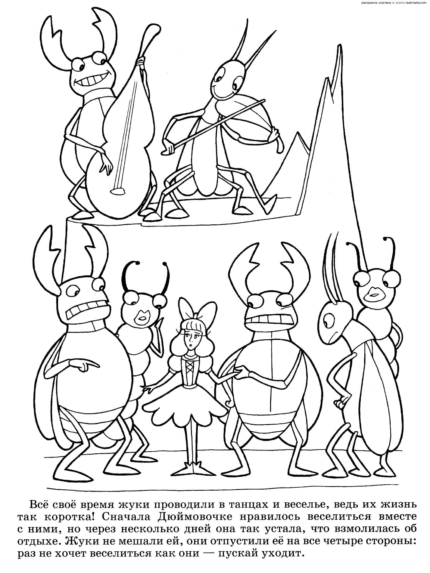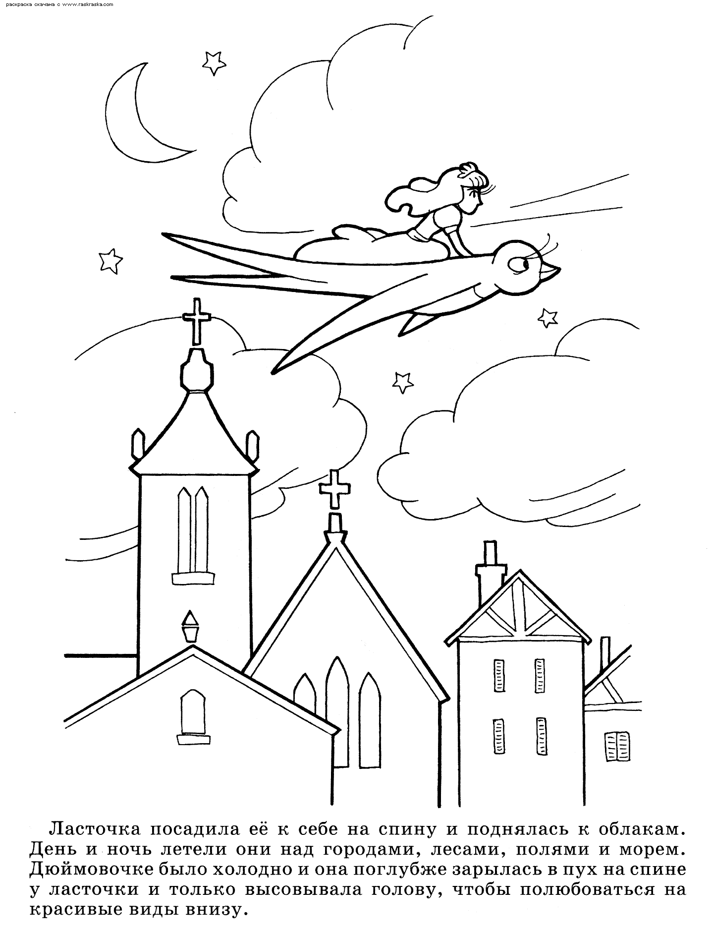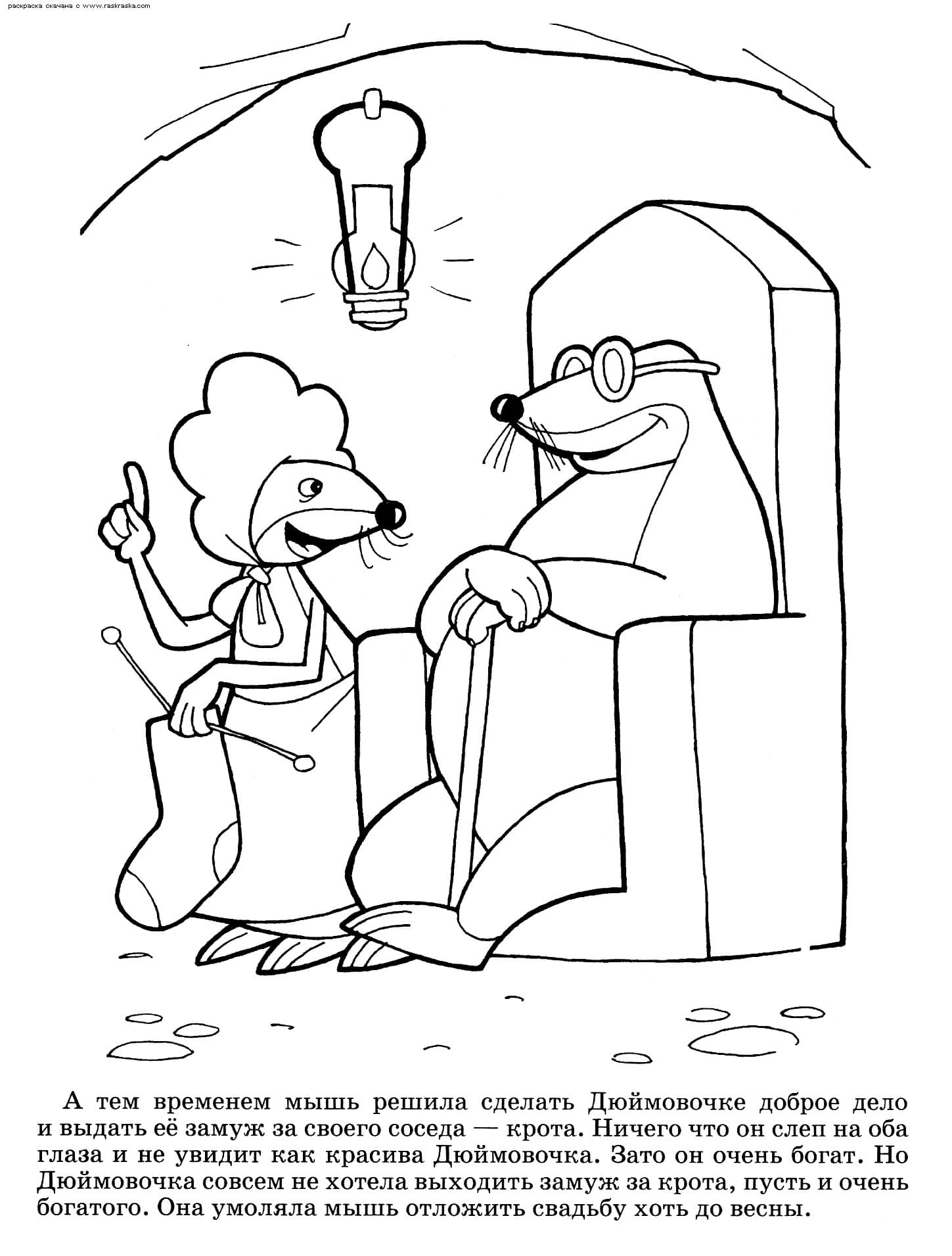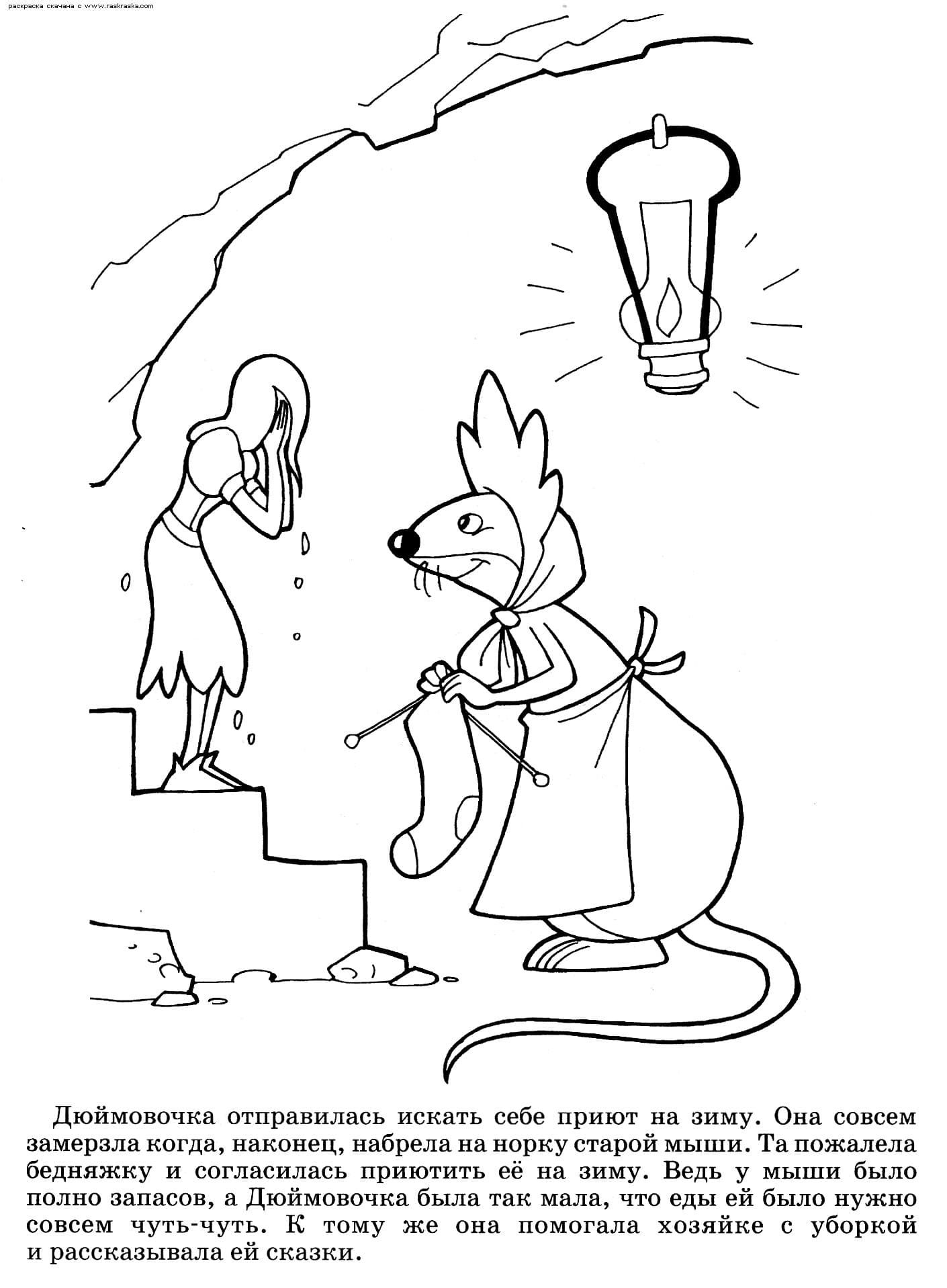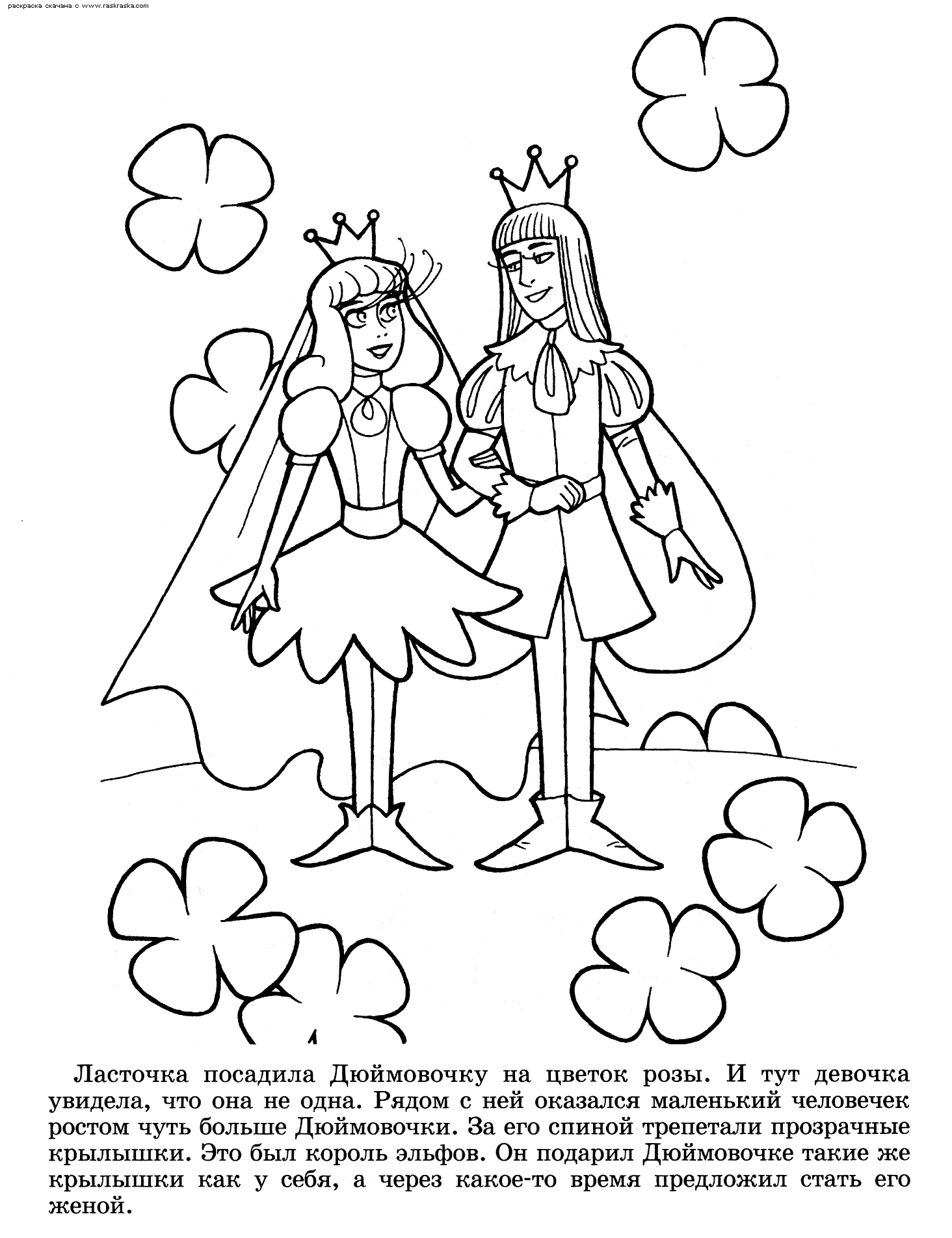 Знаменитая сказка, написанная Гансом Христианом Андерсеном, обретает свою новую жизнь вместе с современной музыкой, пением и танцами. Он переносит зрителя в волшебный мир, где живет рассказчик Оле-лук-Мэй. Он машет волшебной палочкой, и из чудесного цветка появляется крошечная девочка, не больше большого пальца. Сказка рассказывает о приключениях Дюймовочки в старом жилище полевой мыши; с женоподобными болотными жабами, оленьими жуками и кротом. Она успешно избегает их намерений, убегая с ласточкой в далекую страну, где влюбляется в цветочного сказочного принца. На этой странице Вы можете совершенно бесплатно скачать и распечатать раскраску Дюймовочка в хорошем качестве.