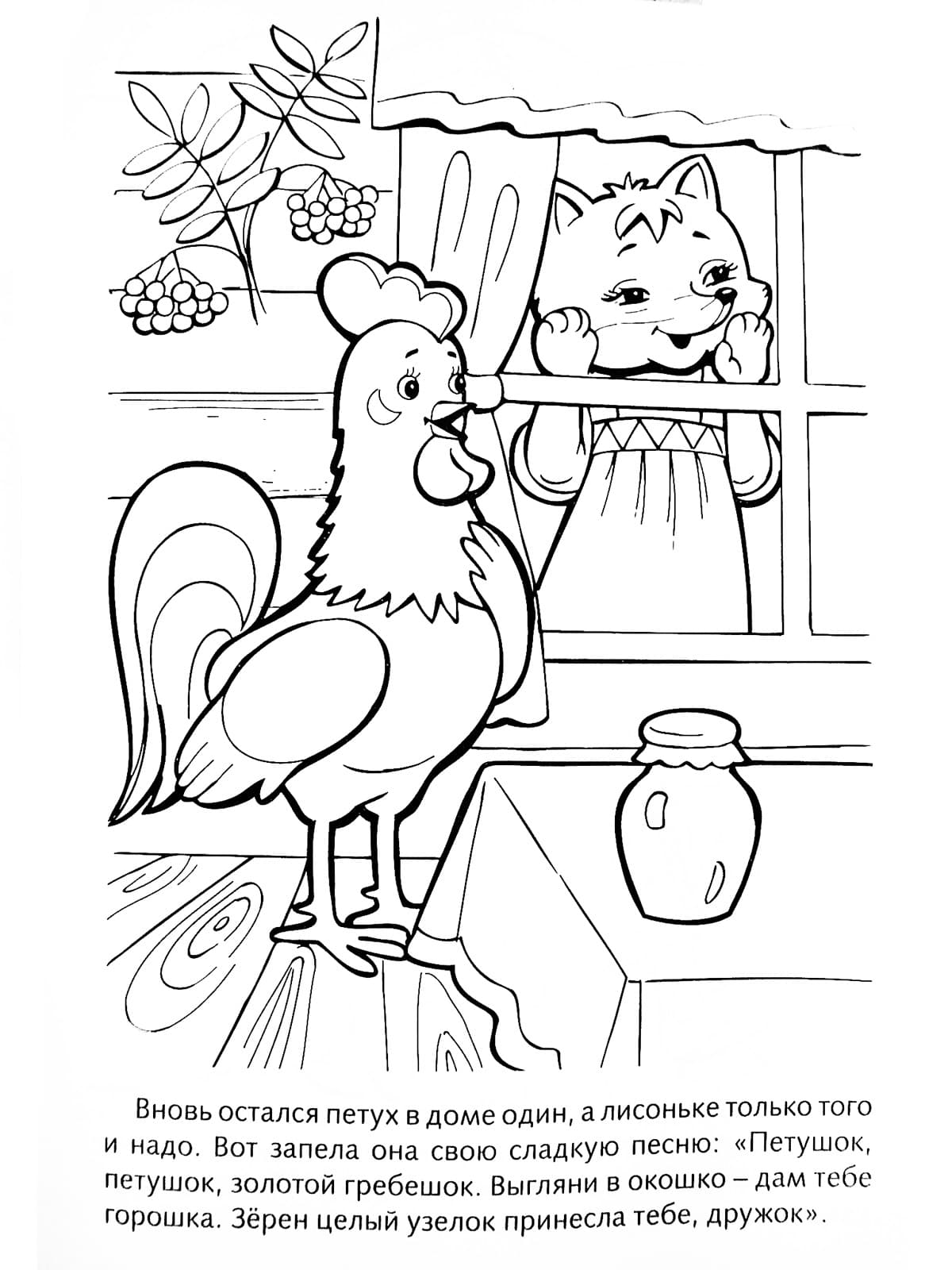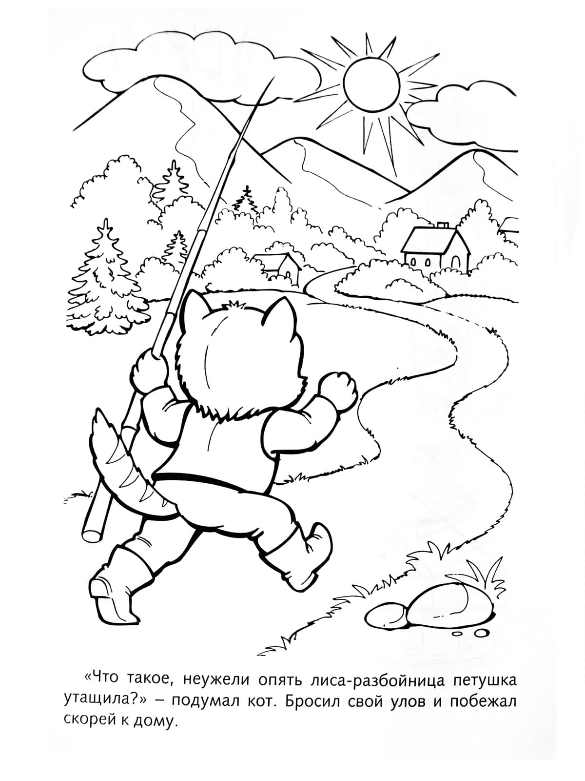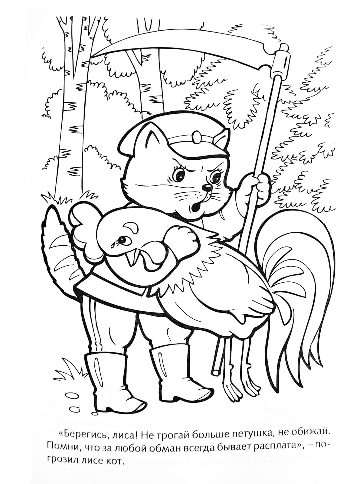 В этой сказке рассказывается о хитрой лисе и мудром коте, который спас петушка. Сказка учит детей дружбе и тому, что необходимо помогать другим в трудную минуту. На этой странице Вы можете найти раскраски Кота, Петуха и Лисы в разных вариациях. Например такие как: лиса убегает с петухом в лапах, добрый кот обнимает петуха, лисичка стучится в окошко к петуху и как кот спасает своего верного друга петуха. На нашем сайте Вы можете совершенно бесплатно скачать и распечатать раскраску кот, петух и лисица в хорошем качестве. Так же на каждой картинке есть текст самой сказки, поэтому скачав все раскраски у вас получится своя книжка.