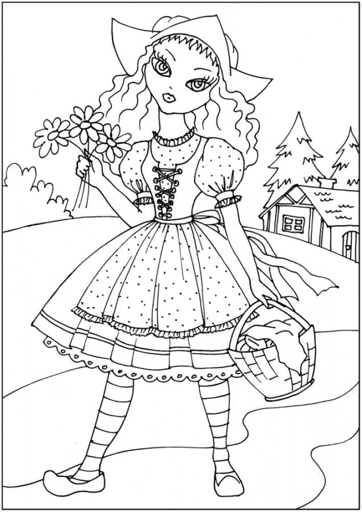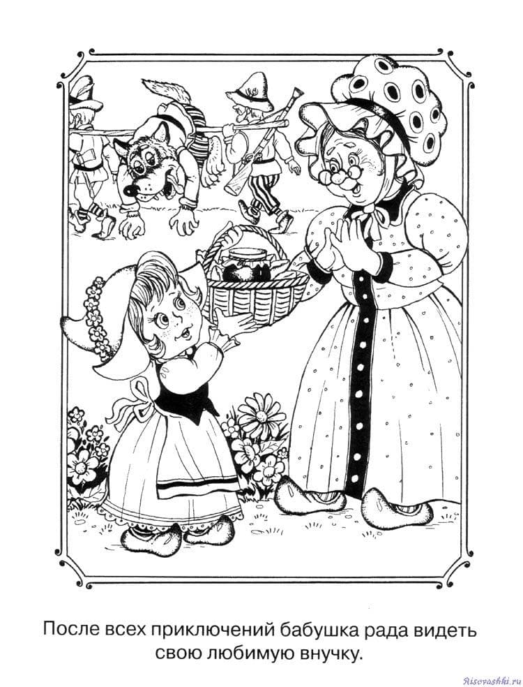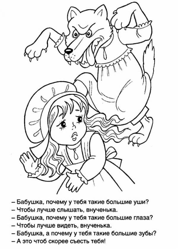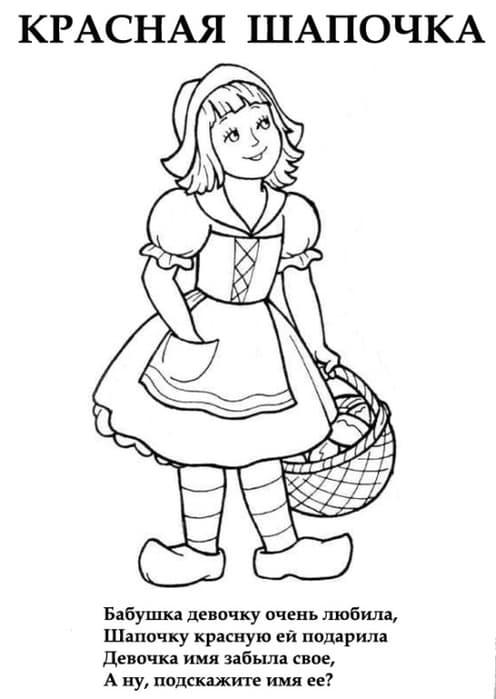 Популярная версия сказки красная шапочка представляет маленькую девочку в красном плаще с капюшоном (по версии Перро) или шапочке вместо капюшона (по версии Гримма, известной как маленькая красная шапочка). Однажды она идет навестить свою больную бабушку и к ней подходит волк которому она наивно говорит где находится её бабушка. Волк идет к бабушкиному дому, входит в него и съедает ее целиком. Затем он переодевается бабушкой и ждет девочку, на которую тоже нападает, когда она приходит. Затем волк засыпает, но появляется герой-лесоруб и рубит волку живот топором. Красная Шапочка и ее бабушка выходят целыми и невредимыми. На этой странице вы можете бесплатно скачать и распечатать раскраску красная шапочка.