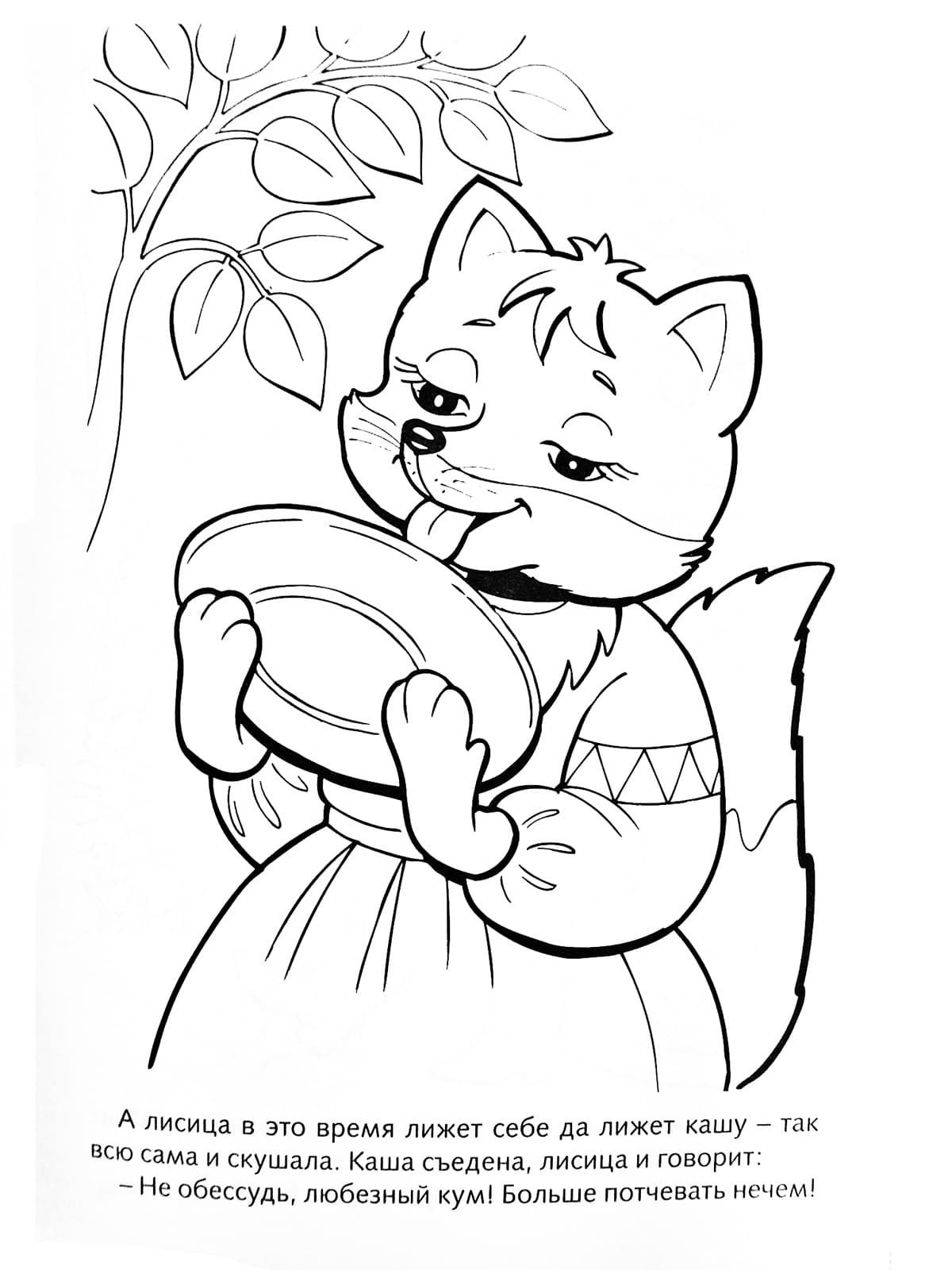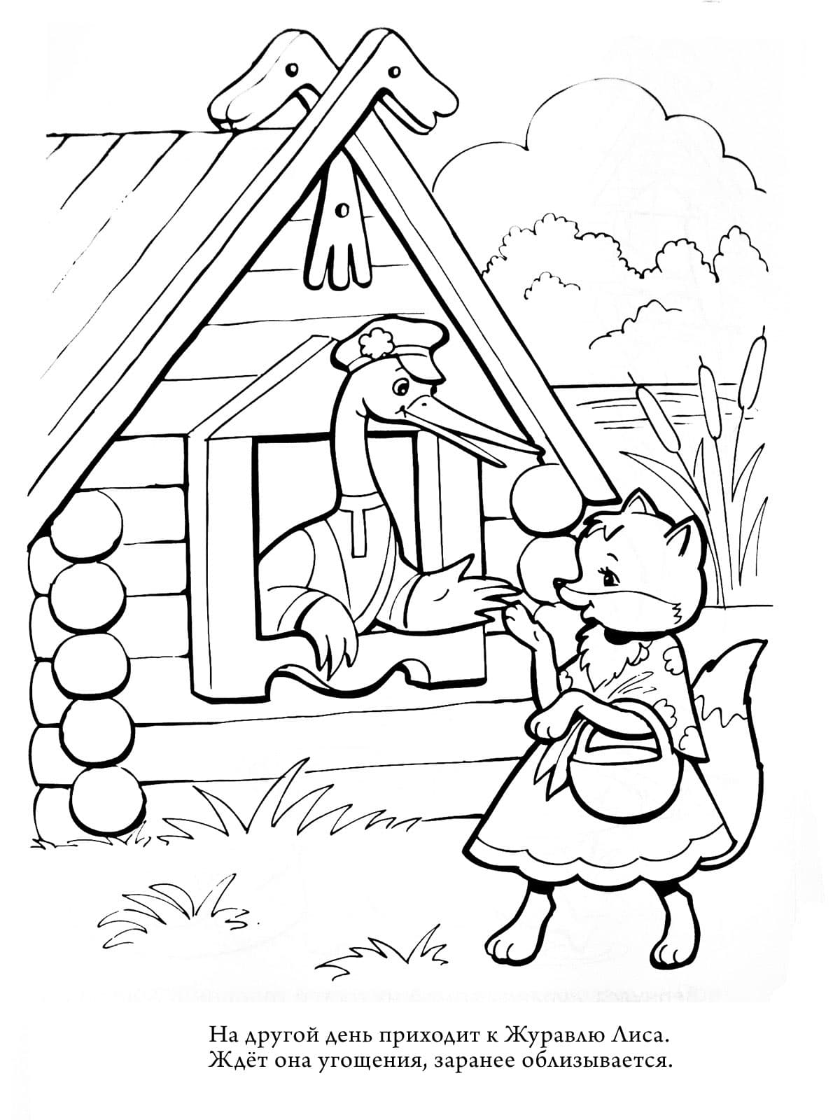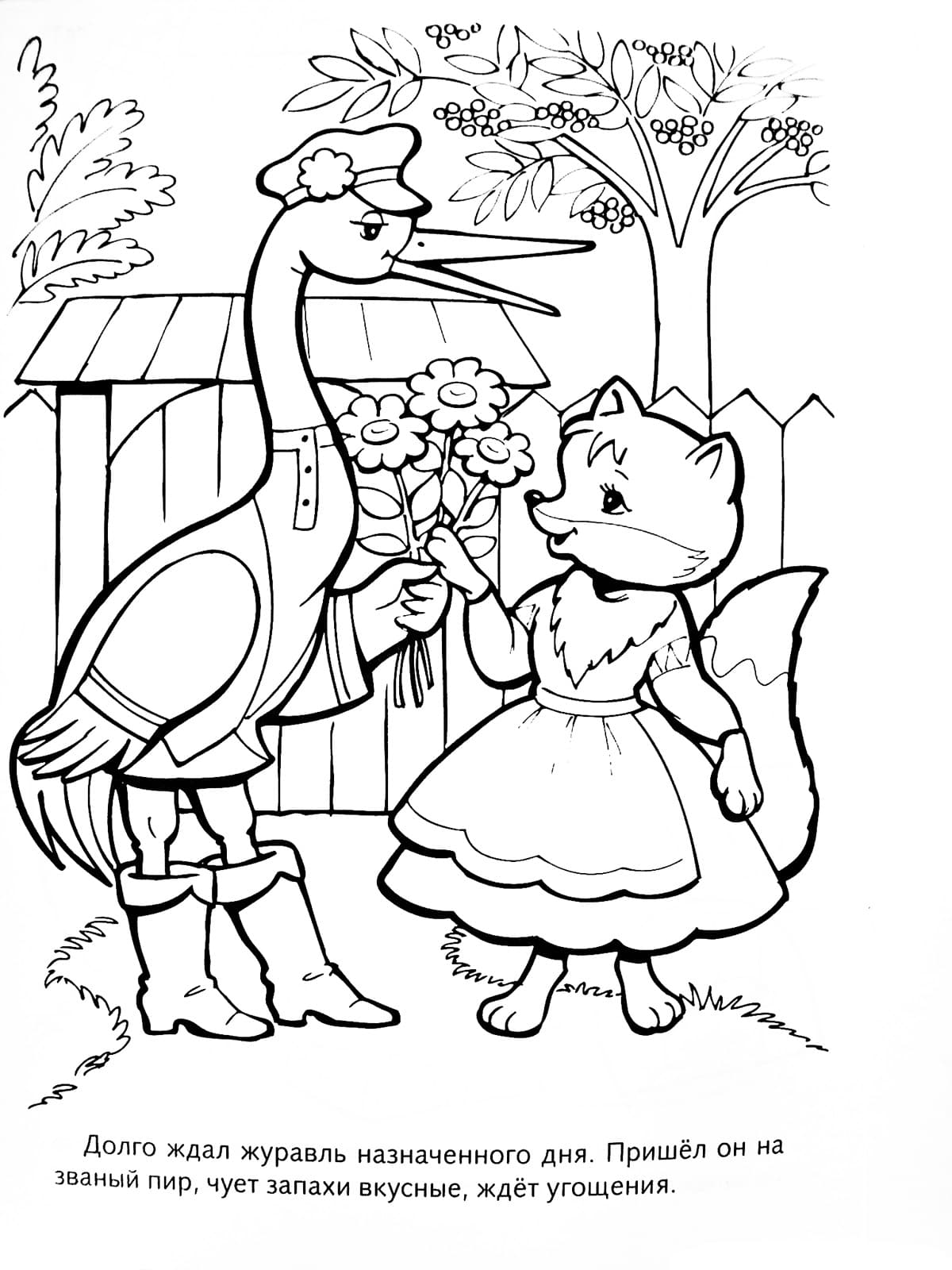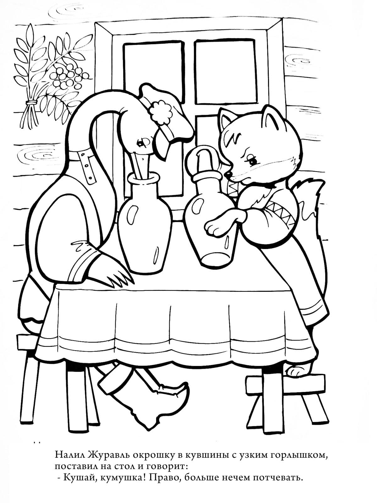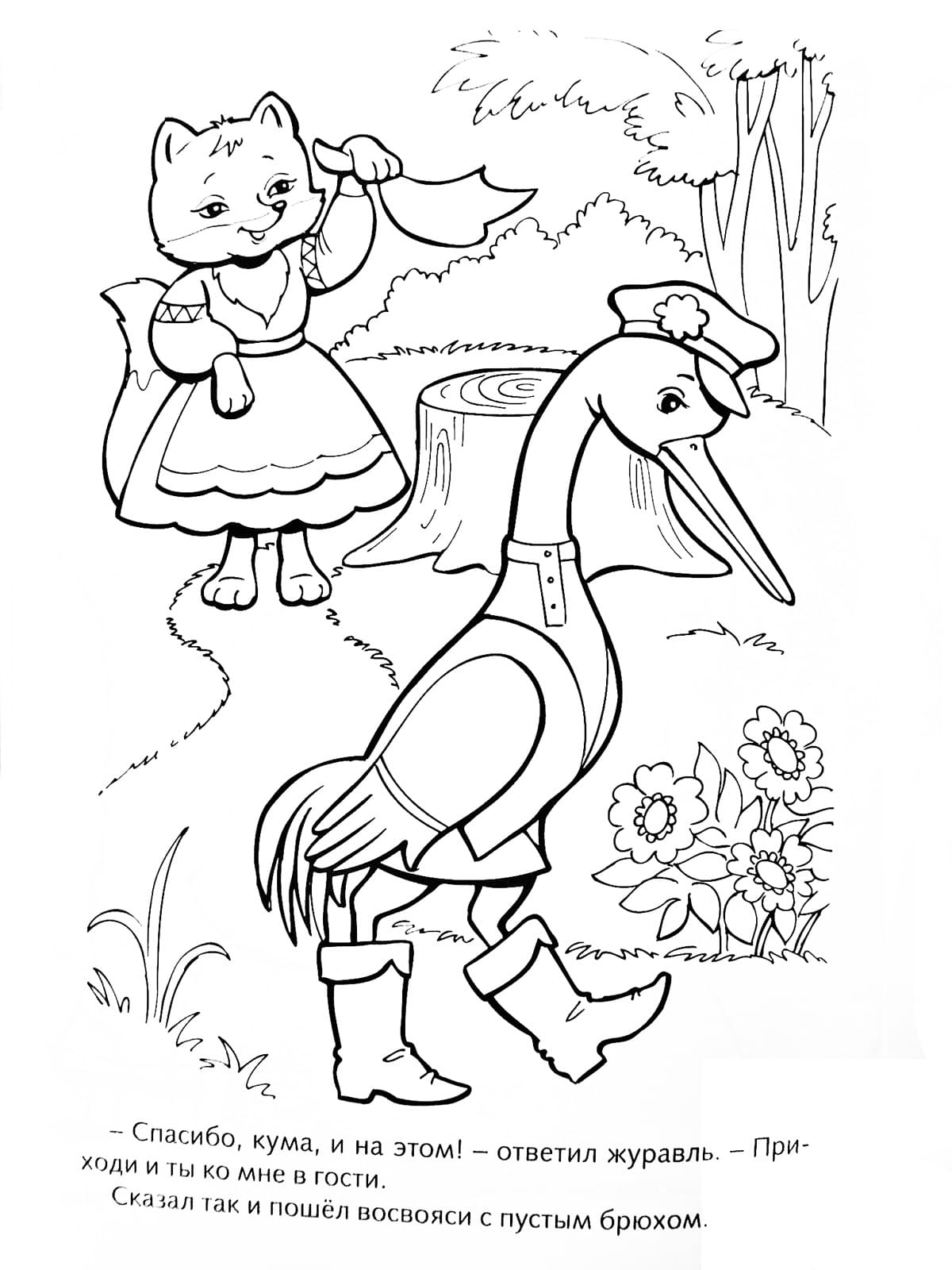 Лиса приглашает аиста поесть вместе с ней и дает суп в миске, который лиса может легко лакать; однако аист не может пить его своим клювом. Затем аист приглашает лису на трапезу, которая подается в узкогорлом сосуде. Это легко для аиста, но невозможно для лисы. Мораль заключается в том, что обманщик должен ожидать взамен обмана и что золотое правило поведения состоит в том, чтобы делать с другими то, что он хотел бы для себя. На нашем сайте Вы можете бесплатно скачать и распечатать раскраску лиса и журавль в хорошем качестве.