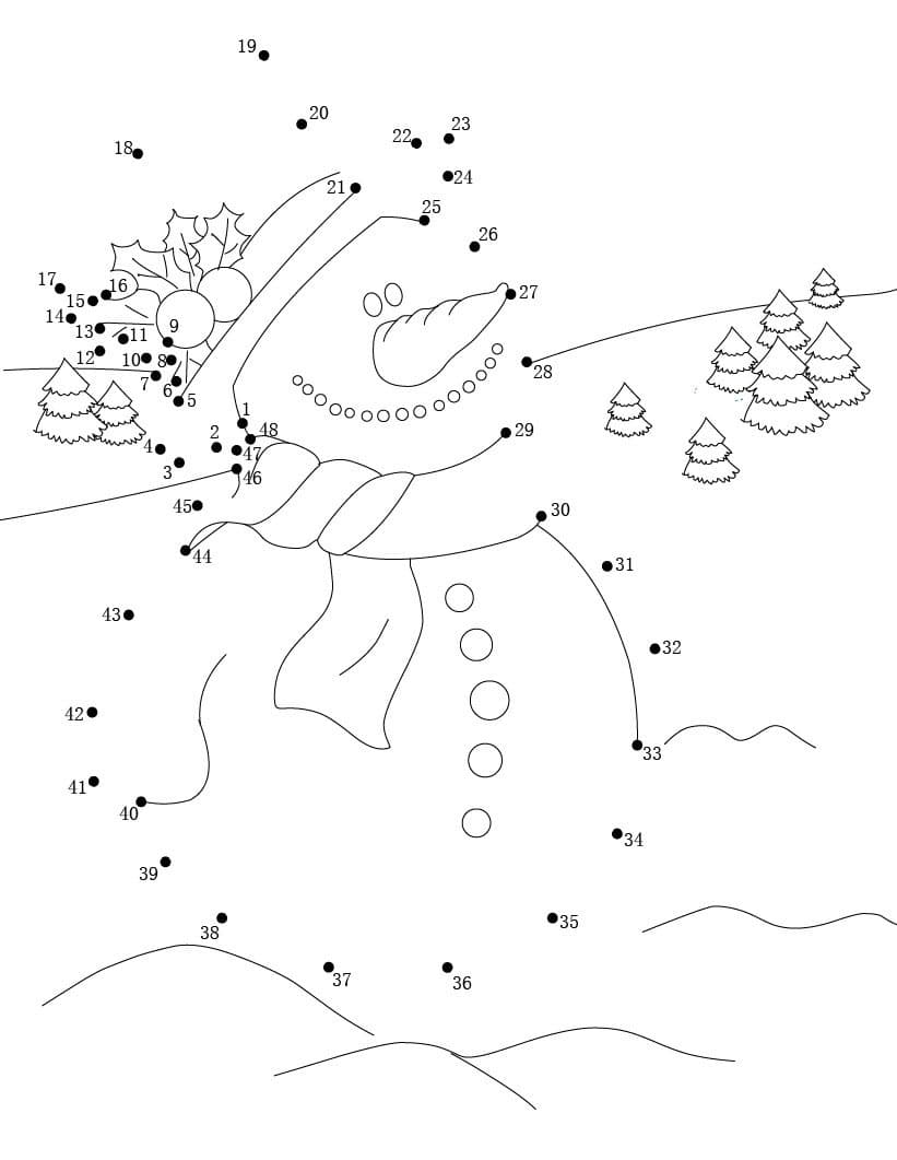 Новогодние раскраски по точкам - очень интересный вид раскрасок, в котором необходимо правильно соединить все точки для получения рисунка. Если ребенок соединит точки в неправильном порядке - рисунок выйдет не в правильной форме. Процесс соединения точек и раскрашивание отлично влияют на развитие моторики рук и мозга. Также, как уже доказали ученые-разукрашивание очень хорошо тренируют усидчивость и терпеливость. На нашем сайте Вы совершенно бесплатно можете скачать и распечатать раскраску по точкам на Новый Год. Тут можно найти веселого деда мороза со снегурочкой, красивую снежную бабу и множество других изображений.