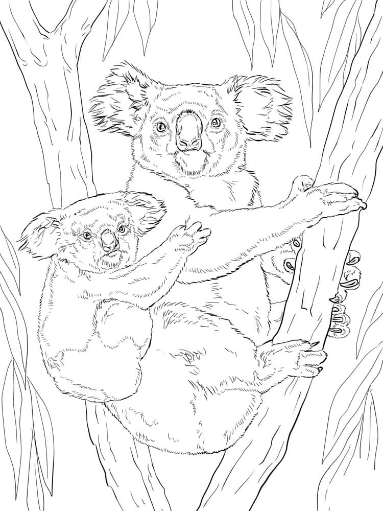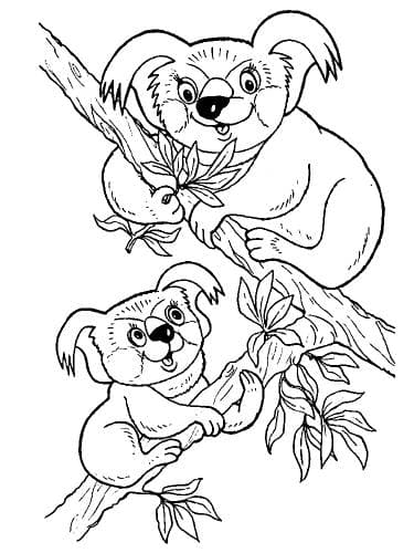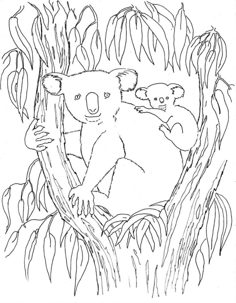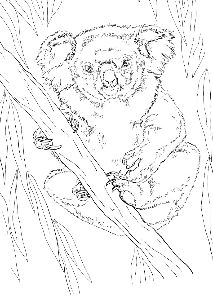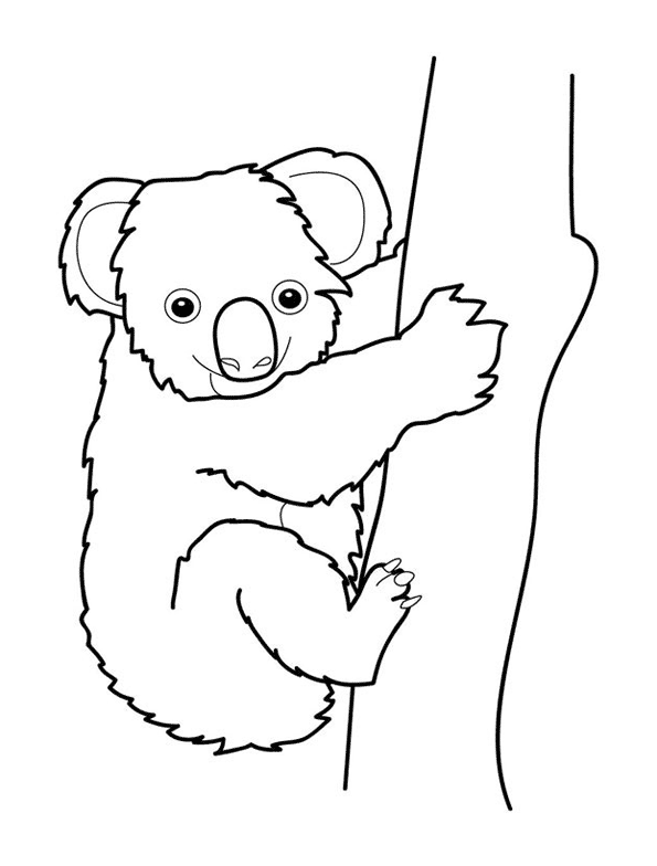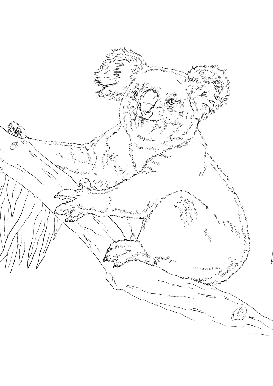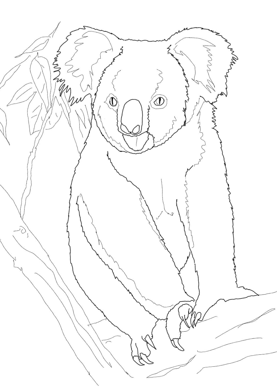 Коала, также называемая медведицей коала, обитающая на деревьях сумчатая из прибрежной Восточной Австралии. Коала имеет длину от 60 до 85 см и весит до 14 кг, в южной части своего ареала (Виктория), но только примерно вдвое меньше, чем в субтропическом Квинсленде на севере. Практически бесхвостое, тело толстое и серое, с бледно-желтой или кремовой грудью и пятнами на крупе. Широкое лицо имеет широкий, округлый, кожистый нос, маленькие желтые глаза и большие пушистые уши. Лапы сильные и когтистые; два внутренних пальца передних лап и самый внутренний палец задних лап противостоят друг другу для захвата. Из-за поверхностного сходства этого животного с маленьким медведем коалу иногда называют, хотя и ошибочно, медведем-коалой. На нашем сайте Вы совершенно бесплатно можете скачать и распечатать раскраску коала в хорошем качестве.