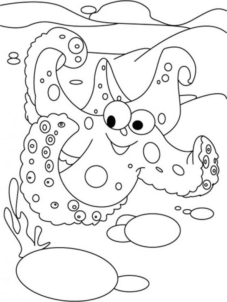 Морская звезда, любое морское беспозвоночное животное класса Asteroidea, имеющее лучи или руки, окружающие неясный центральный диск. Несмотря на их более старое общее название, они не являются рыбами. Примерно 1600 живых видов морских звезд встречаются во всех океанах; наибольшим разнообразием обладает северная часть Тихого океана. Большинство видов имеют от 20 до 30 см в поперечнике; некоторые - только 1 см, а другие-до 65 см в поперечнике. Руки морской звезды-обычно их пять-полые и, как и диск, покрыты короткими шипами и педицелляриями (клещевидными органами); на нижней стороне имеются бороздки с рядами трубчатых ножек, которые могут быть с присосками или заостренными. Морская звезда может потерять одну или несколько рук и вырастить новые. Её трубчатые ножки позволяют ей ползти в любом направлении и цепляться за крутые поверхности. На нашем сайте Вы бесплатно можете скачать и распечатать раскраску морская звезда в хорошем качестве.